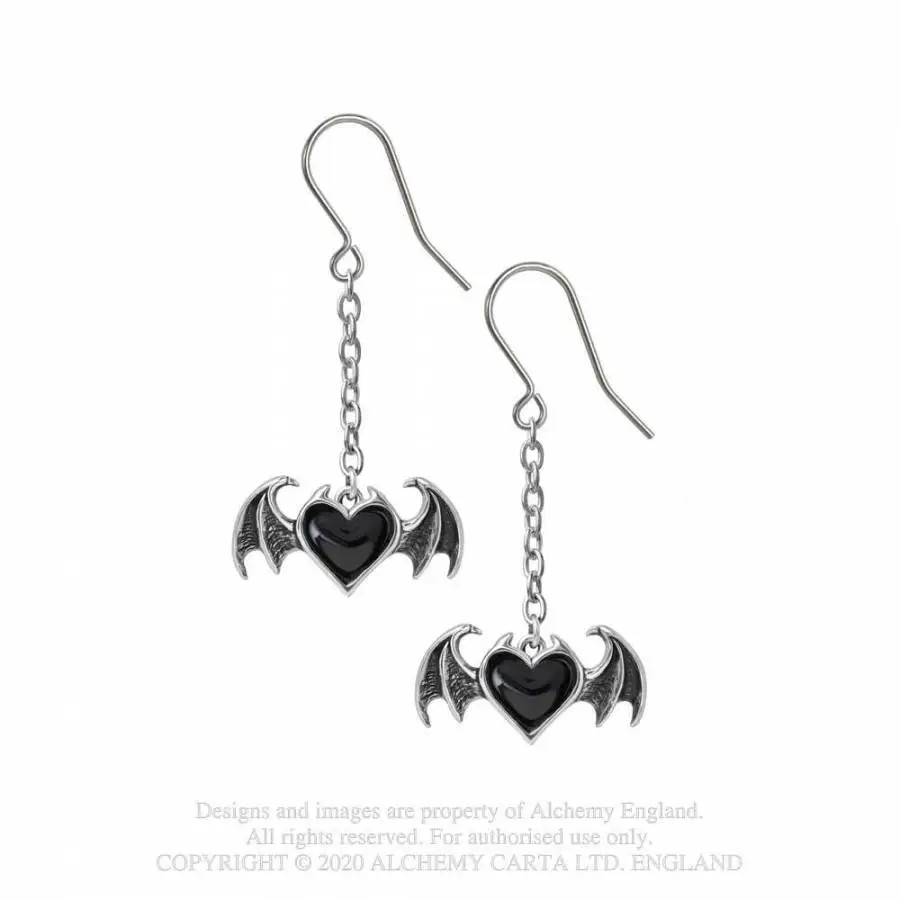 Un coeur émaillé d’un noir intense entouré par des ailes de chauves-souris