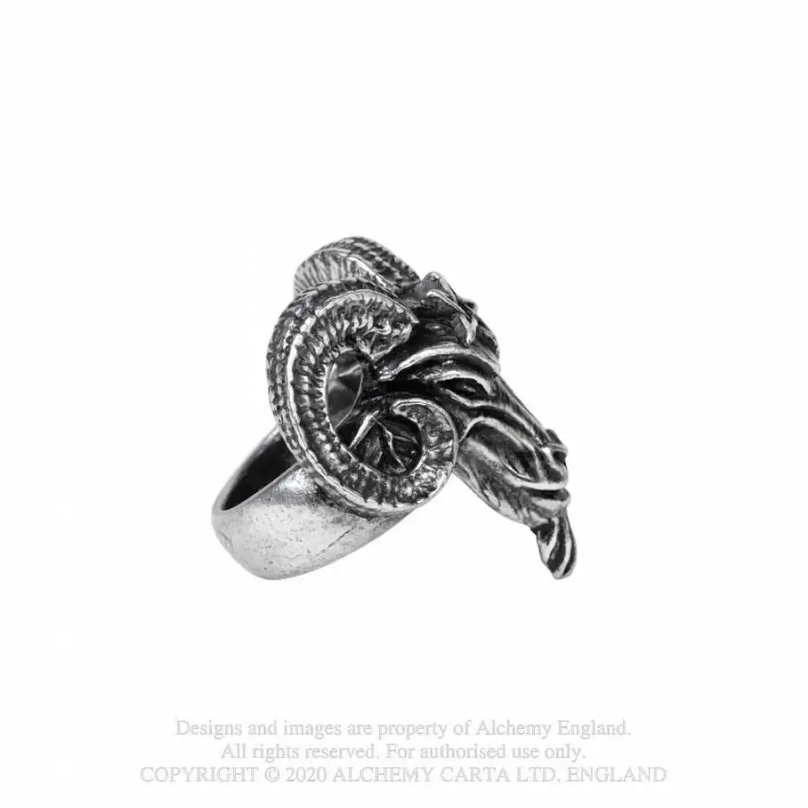 Une grosse bague en étain vieilli représentant une tête de chèvre à cornes avec un pentagramme sur le front, le fameux Baphomet !