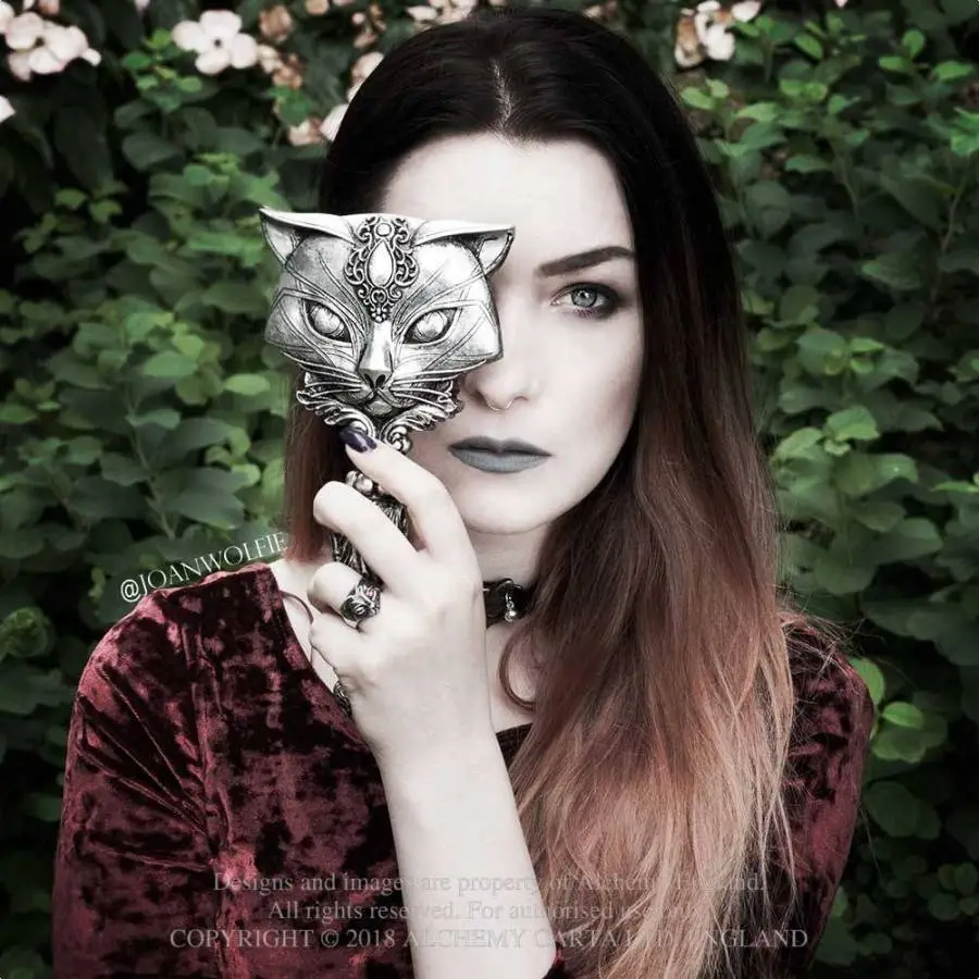 Un anneau de tête de chat en étain noir partiellement éclairé, avec ses yeux en amande de cristaux Swarovski rouges