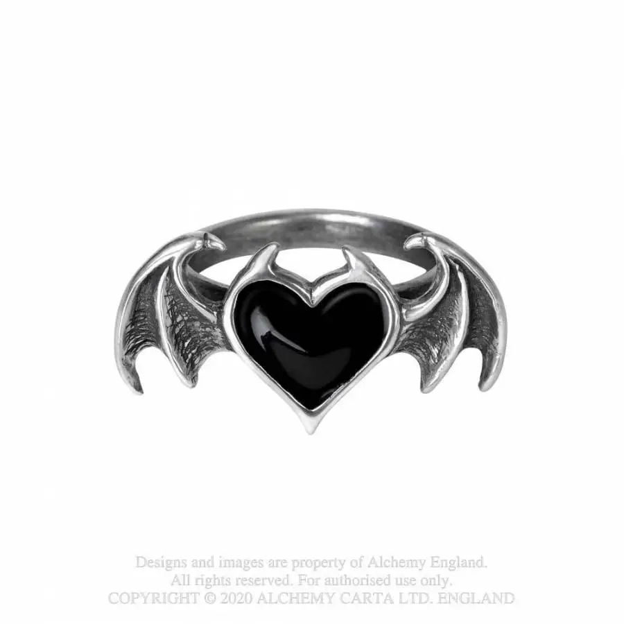 Une délicate bague en étain formant un coeur en émail noir avec des ailes de chauve-souris s’étendant sur un peu plus de la largeur du doigt