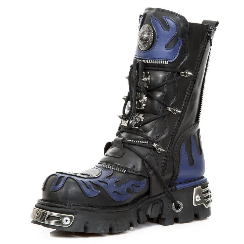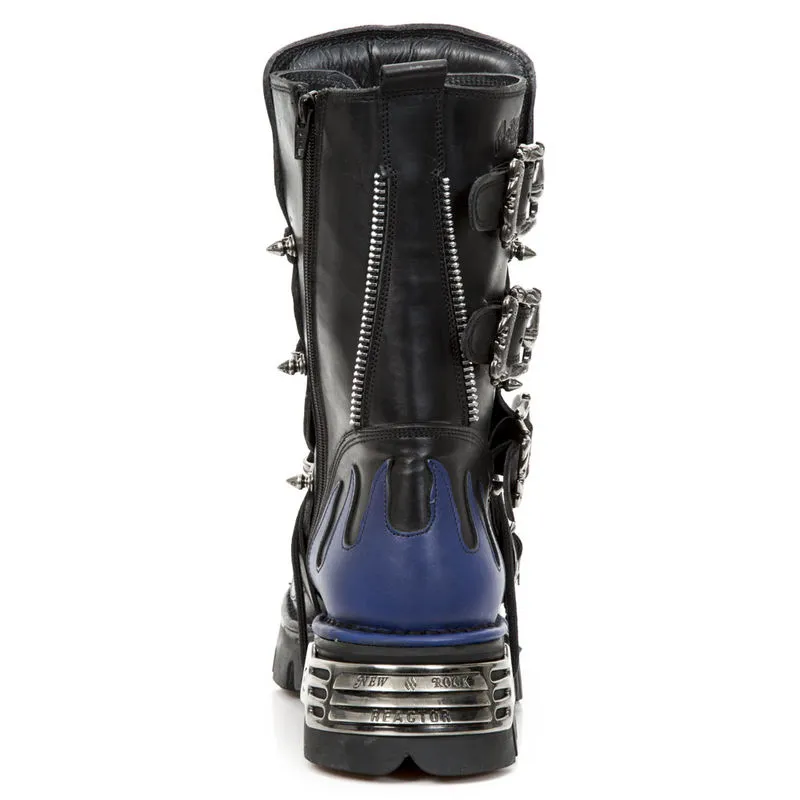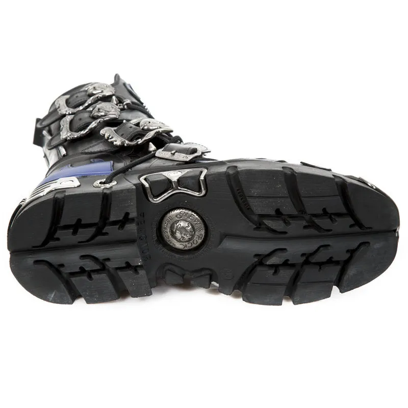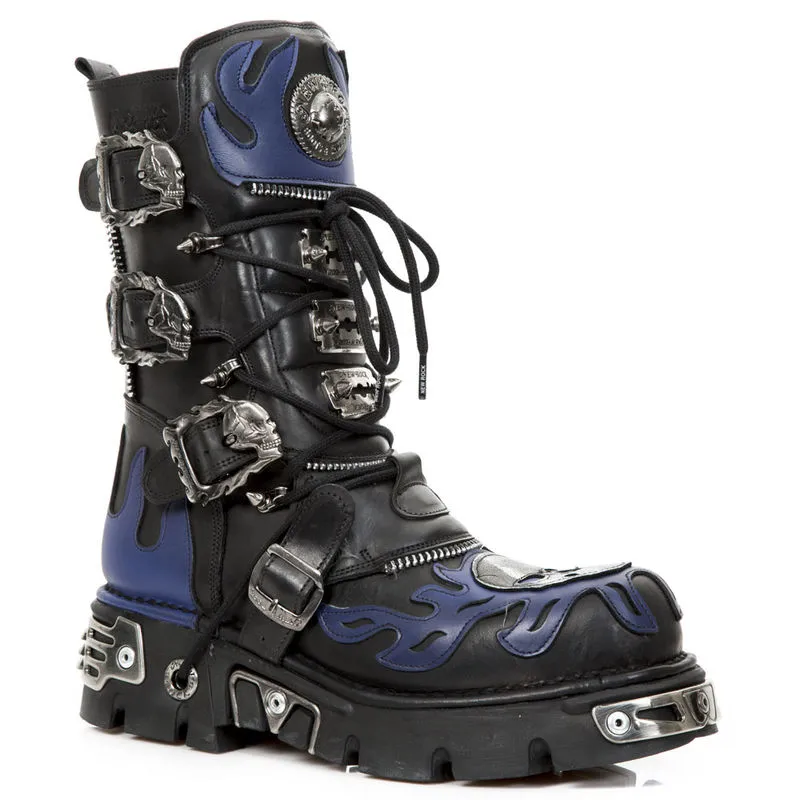 Les New rock M.1007-C2 sont décorée de lames de rasoir, de boucles métalliques en forme de têtes de mort, de zips de décoration et d’un grand skull en cuir gris sur l’avant des bottes