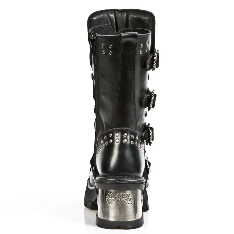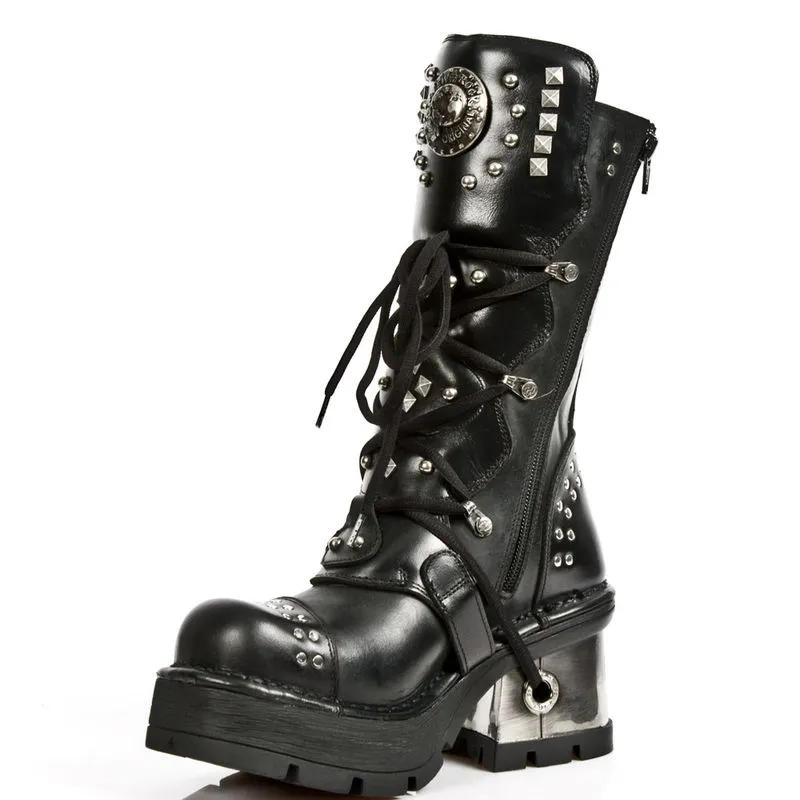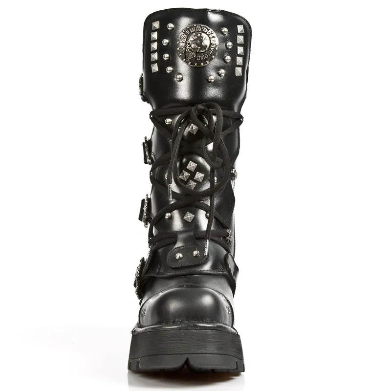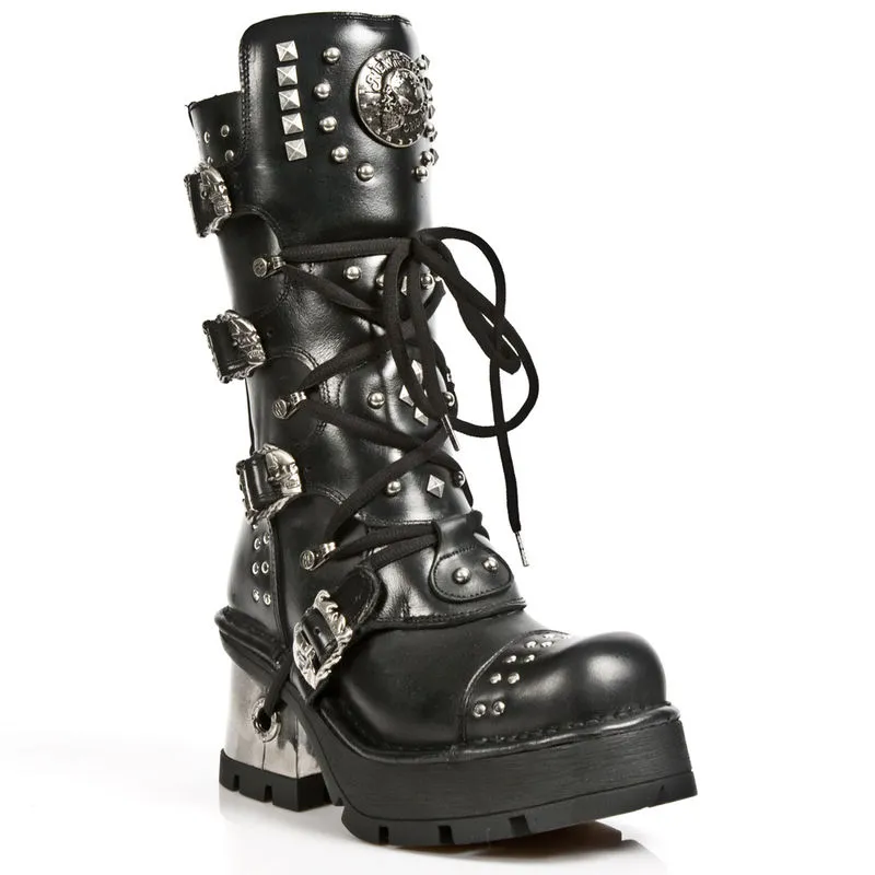 Bottes unisexe en cuir noir décorées de rivets métalliques, elles possèdent un large talon en métal, des sangles de réglage avec boucles en forme de skull et de clous pyramidales