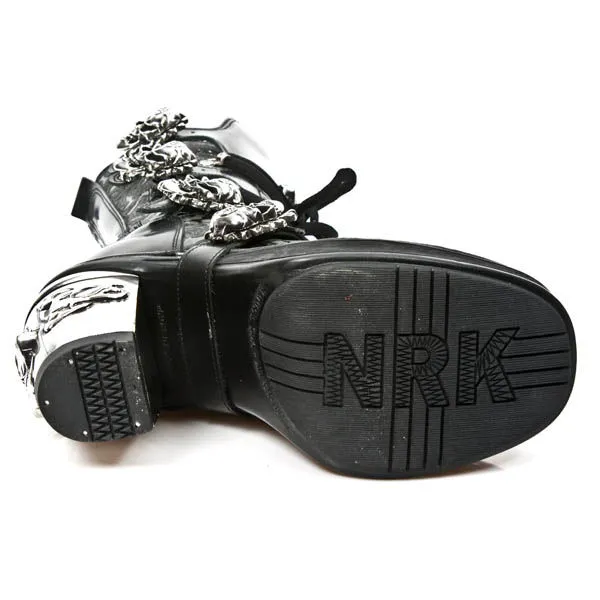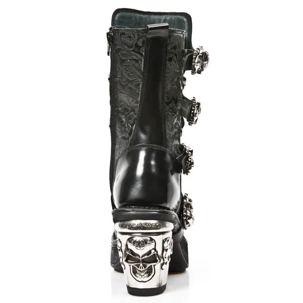 Comme si cela ne suffisait pas New Rock à décidé d’en ajouter un énorme sur l’avant de la botte, encore trop discret pour vous ? Qu’à cela ne tienne, le llarge talon en métal est également orné d’un skull !