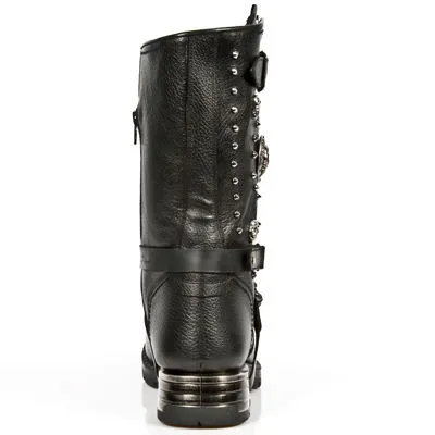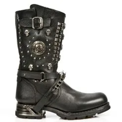 Tout l’esprit new rock dans ces bottes en cuir de style biker, les nombreux clous pyramides ainsi que les têtes de mort, les talons en métal et pour finir une chaîne de vélo, amateurs de look discret et passe-partout, passez votre chemin car ces bottes cuir ne passeront pas inaperçu !
