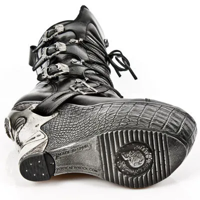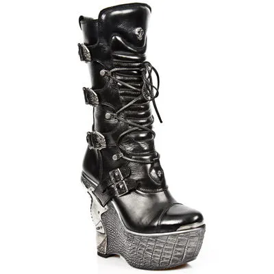 Bottes en cuir noir avec grosses semelles compensées, le talon est décoré d’une grand plaque de métal, boucles de sangles en forme de skull, laçage frontal, fermeture éclair intérieure