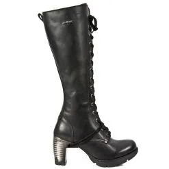 Grandes bottes en cuir noir new rock avec talon métal très original, le grand laçage à l’avant lui donne un style gothique, fermeture éclair intérieure