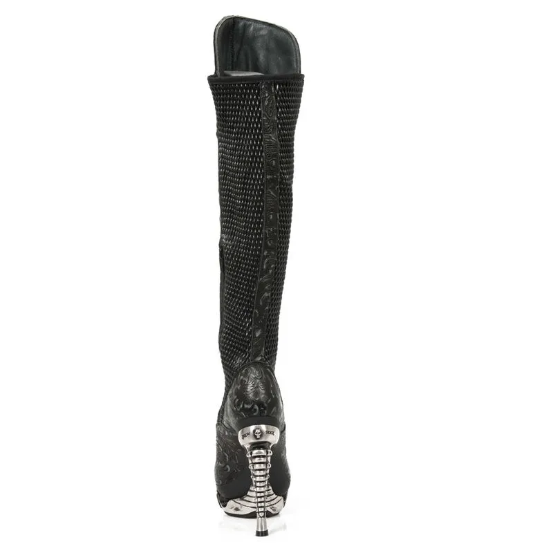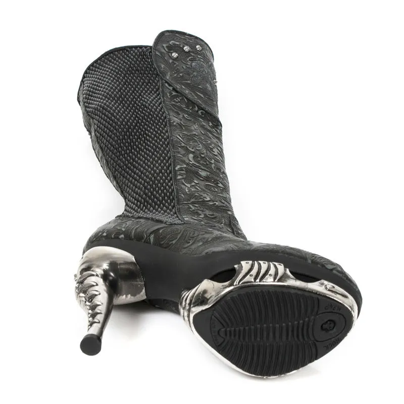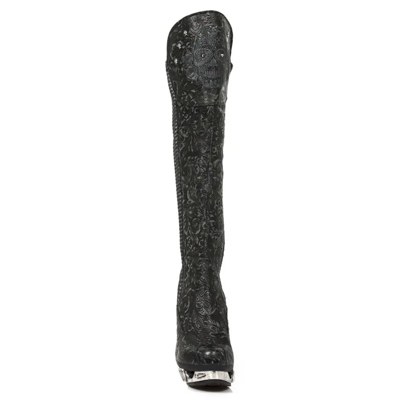 Très hautes bottes New Rock, en cuir bi-matière noir. L’un est surpiqué et l’autre est orné de motifs baroques aux allures florales, sur lequel on distingue une tête de mort style mexicaine ainsi que de petits clous. Un sublime talon métallique fuselé en forme de colonne vertébrale accompagné d’une plateforme en métal également vous apportera confort et originalité.