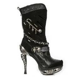 Grandes bottes en cuir noir bi-matière au style inimitable. Du talon en métal fuselé en forme de colonne vertébrale à l’effet croco sur le devant et le haut de la botte, en passant par la chaîne de têtes de mort métalliques, la sangle ornée d’une boucle en forme de crâne, l’effet déchiré et l’épingle à nourrice géante sur le côté extérieur ; tous les éléments de cette chaussure rassemblés font son originalité et son style incomparable. La marque New Rock est la référence absolue pour toutes celles et ceux qui aiment les looks décalés et hors du commun, tant rock que goth, punk ou encore biker !