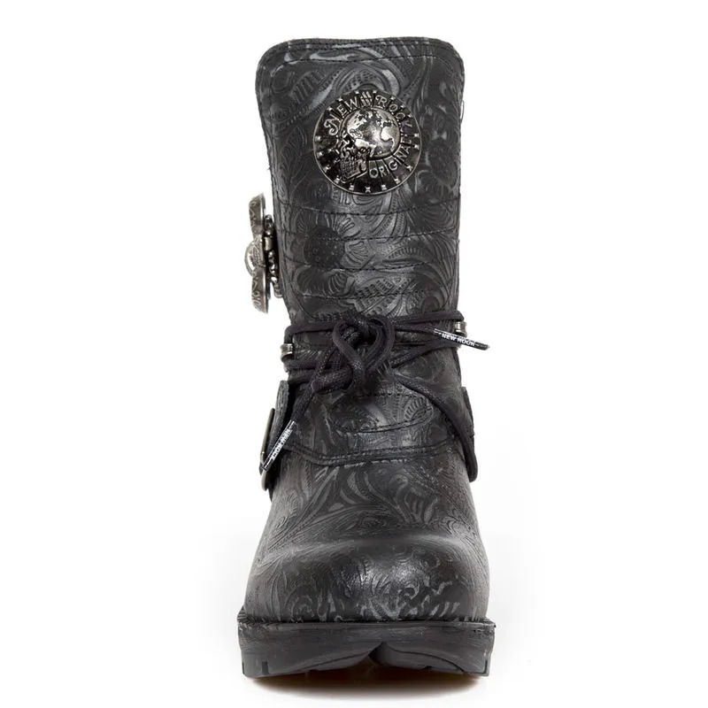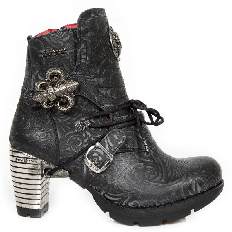 Esprit gothique royaliste pour cette paire de bottines en cuir noir gravé de motifs baroques gris