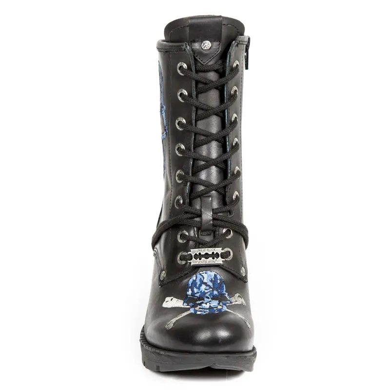 Ces bottines en cuir noir sont agrémentées de patchs têtes de mort pour un look 100% rock/goth