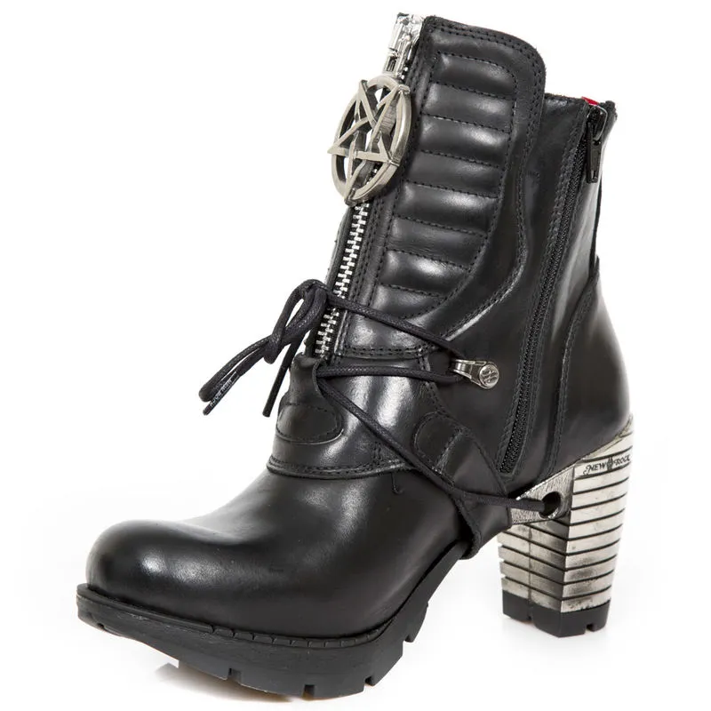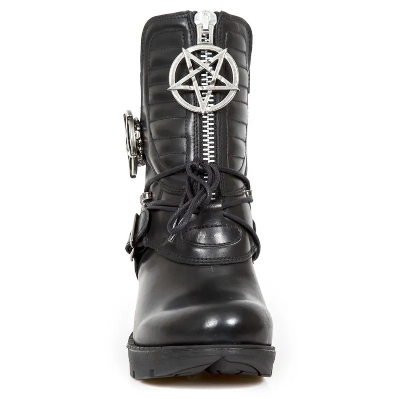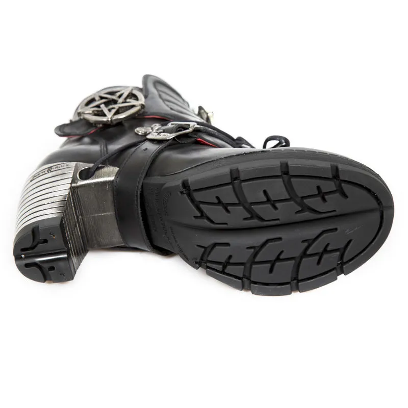Dans un pur esprit gothique,n ces bottines sont décorées de gros pentagrammes inversés, les talons métalliques spécifiques à New Rock apportent une belle touche originale