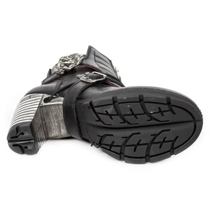 Du 100% gothique ! New rock nous délivre une magnifique paire de bottines pour les amoureuses du style gothique, la grande croix inversée, les talons en métal, la grosse boucle en forme de rose et la forme sont dans le pur esprit goth