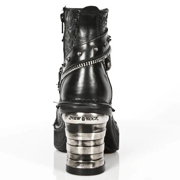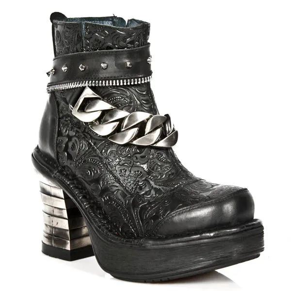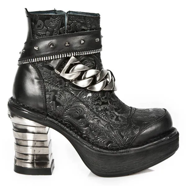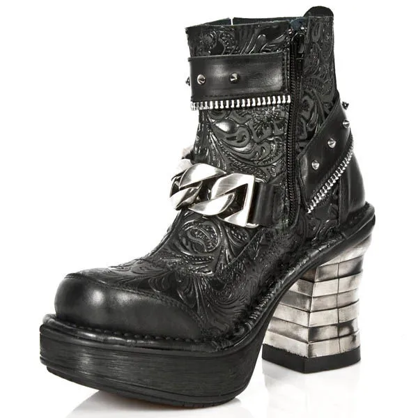 Bottines New-Rock en cuir , elles vous séduiront avec leur décoration baroque et le côté plus rock n’roll avec sa chaîne et sa bride effet fermeture éclair sur le devant orné de spikes , très original avec son talon en métal et sa semelle légèrement compensée, Mesdames il ne faut plus hésiter, il vous faut cette paire de bottines .
