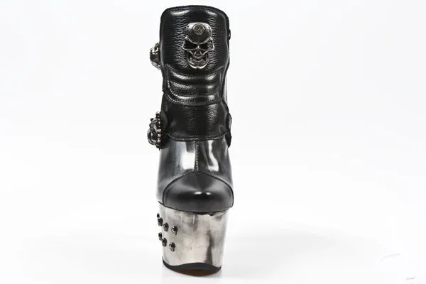 Le très haut talon en métal de 16 cm ne doit pas vous effrayer car une plateforme de 6,5 cm, elle aussi en métal, est à votre disposition pour vous assurer un plus grand confort. Ces sublimes bottines vous feront gagner des centimètres sans aucun effort ! Vous retrouverez également de petites têtes de mort métalliques sur l’arrière du talon et le côté extérieur de la plateforme.