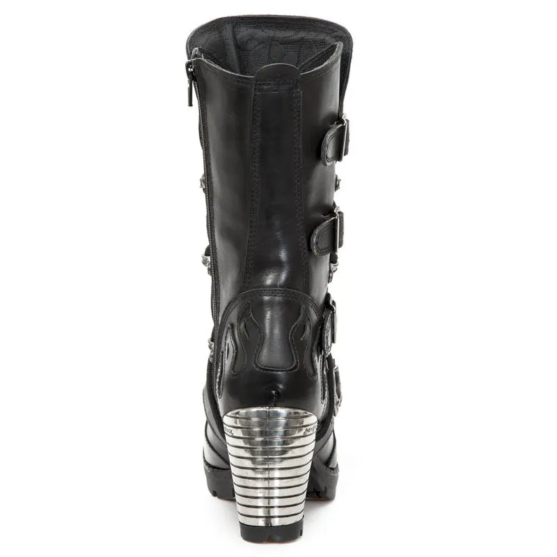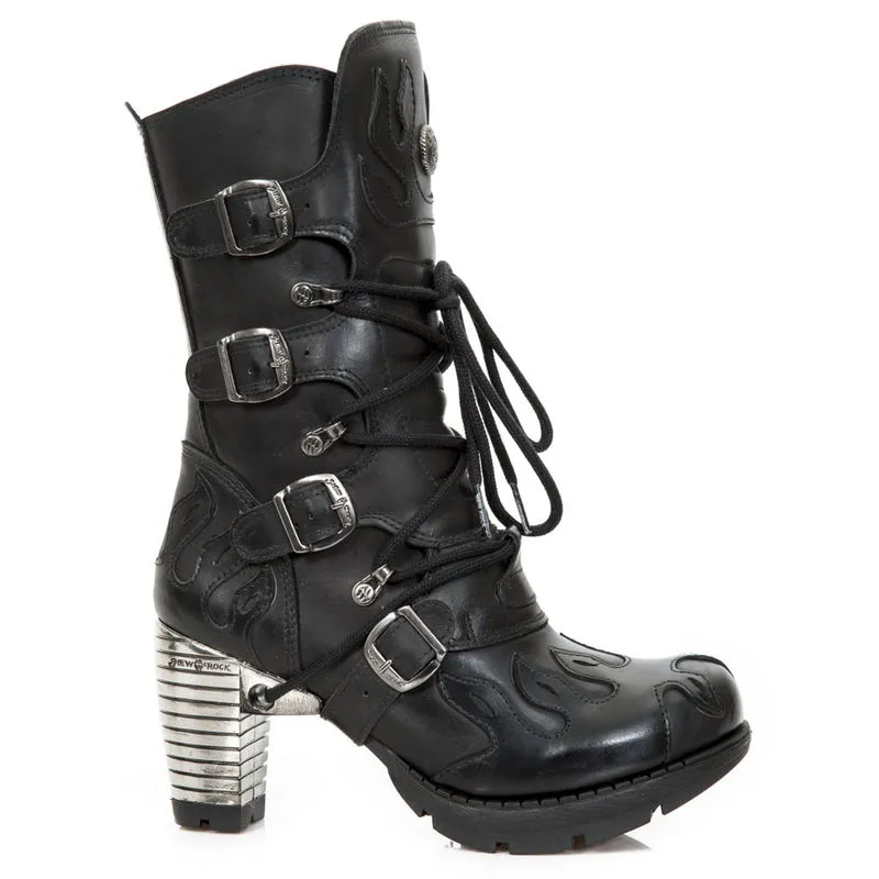 Bottines gothique en cuir noir de chez New Rock avec quatre boucles de décoration sur le côté extérieur de la botte, vous pouvez aussi retrouver le fameux talon en métal spécifique au modèle New Rock, des flammes en surpiqûre viennent décorer la bottine sur l’avant l’arrière et le haut, vous ne passerez pas inaperçu ! alors laissez vous tenter, elles sont faites pour vous !
