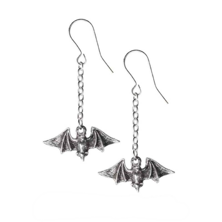 Une petite paire de chauve-souris volantes, boucles d’oreilles compte-gouttes en étain suspendues à une fine chaîne
