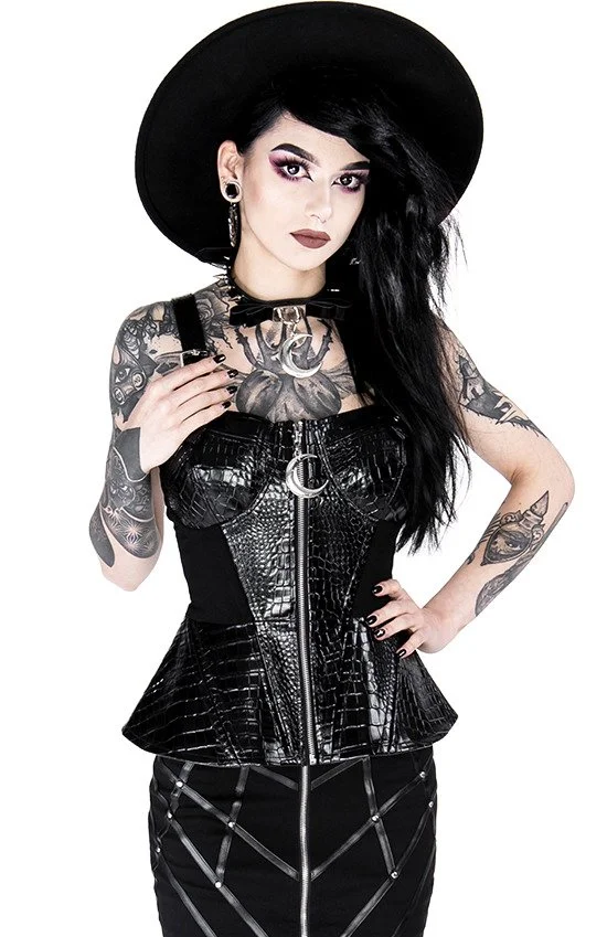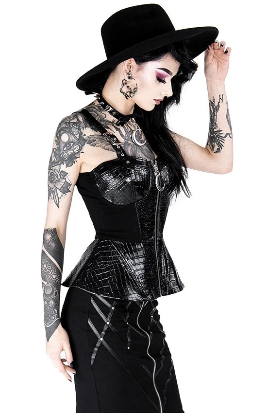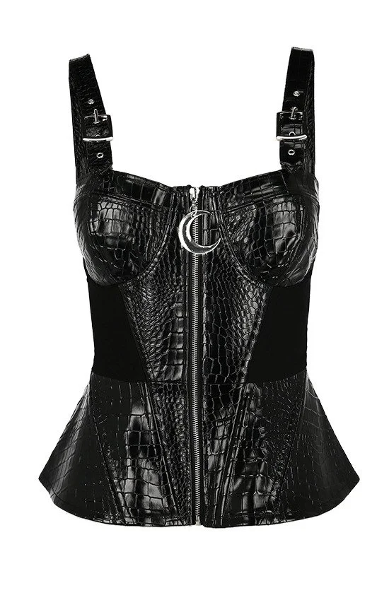 Ce bustier signé Restyle est composé d’une partie en simili cuir look alligator et d’une partie en tissu