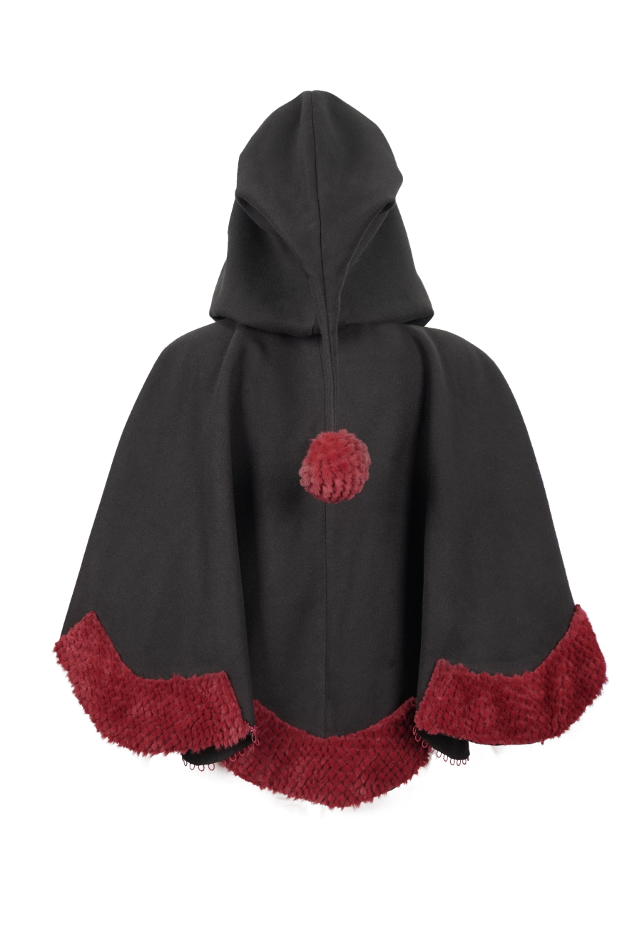 Fausse fourrure rouge en bordure de capuche et au bas de la cape