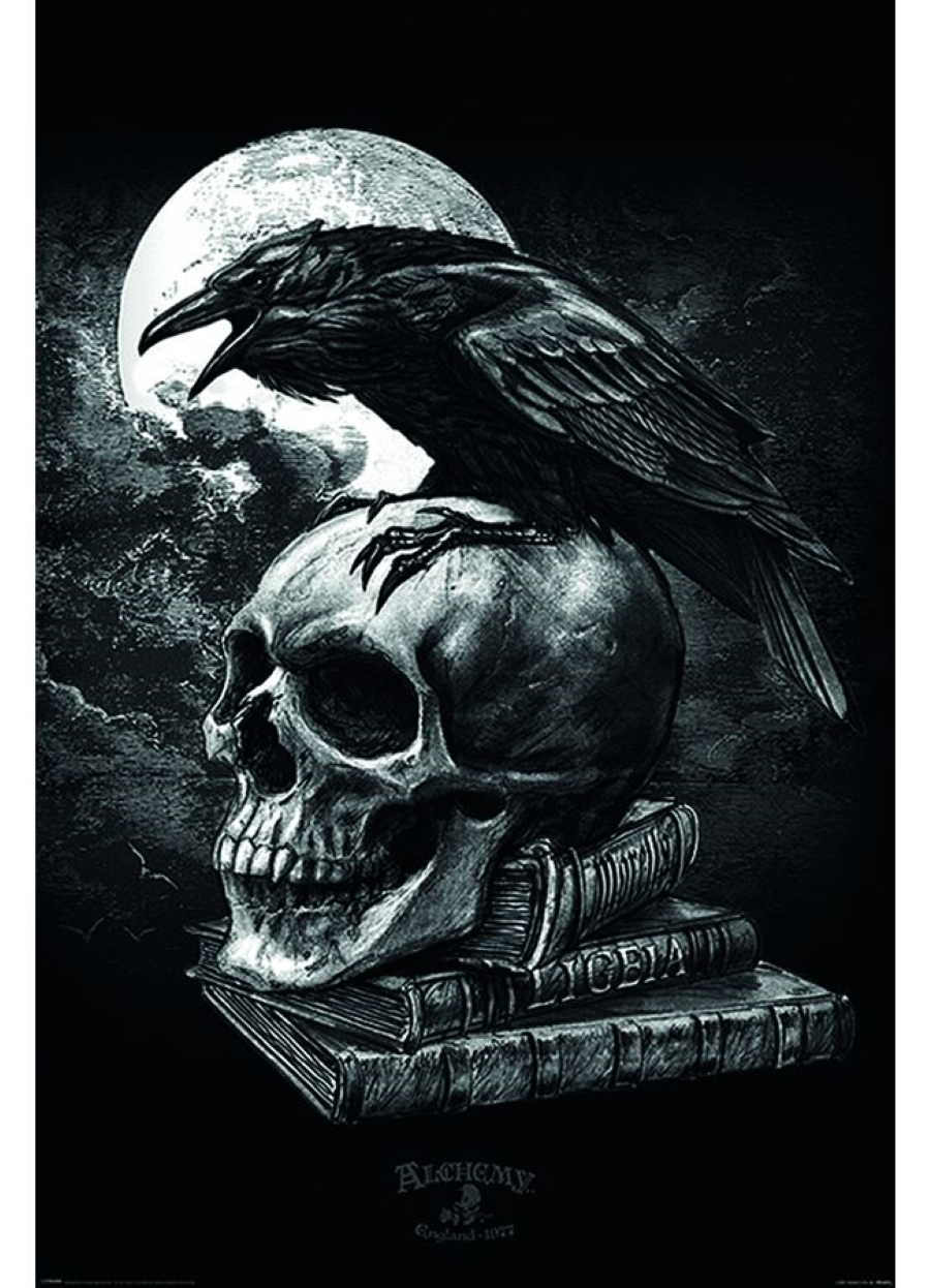Le dessin signé Alchemy représente un corbeau noir posé sur un crâne humain et sur des livres