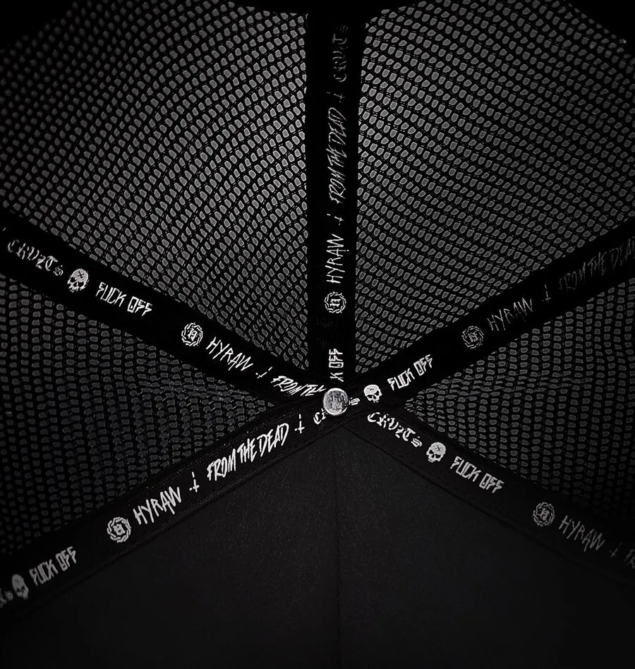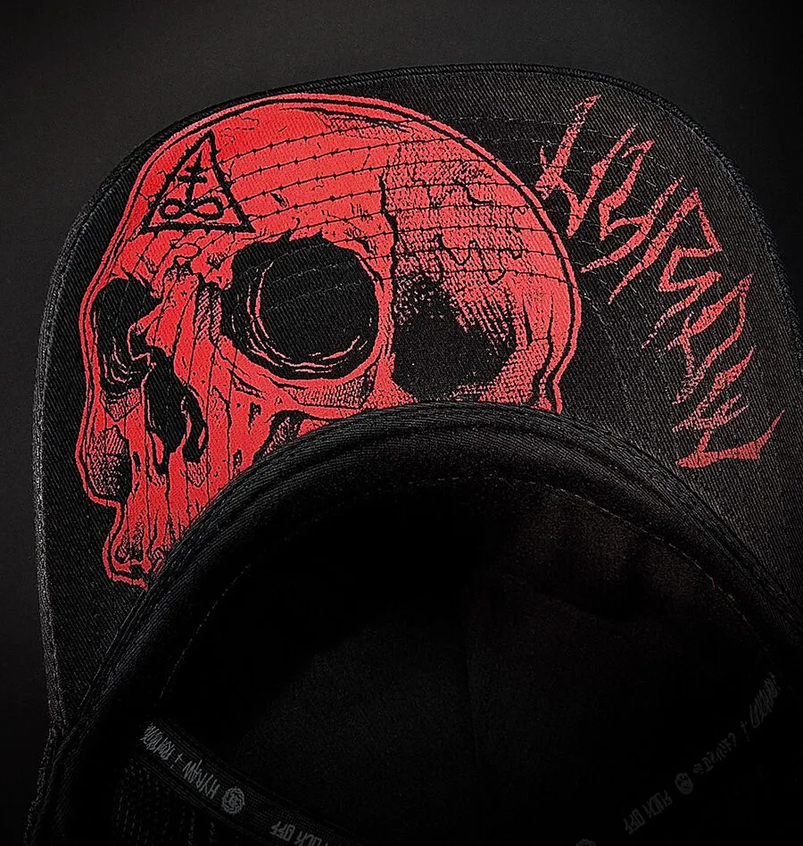 Très belle casquette noire et rouge de type rock métal gothique signée Hyraw