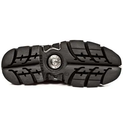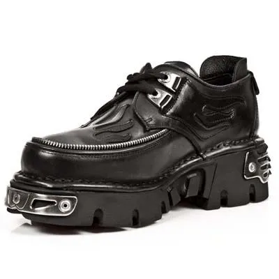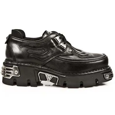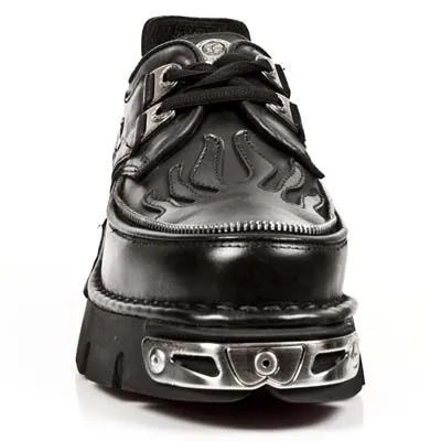 Belle paire de chaussures en cuir noir décorée de flammes ton sur ton, elle possèdes les semelles reator avec des fers métalliques