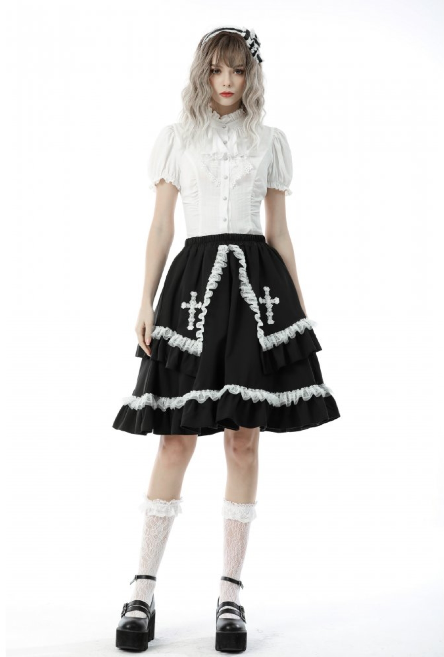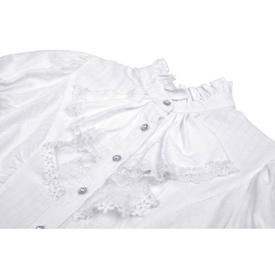 Ce chemisier Dark In Love à manches courtes de type gothique victorien est fabriqué dans un tissu blanc de toute beauté