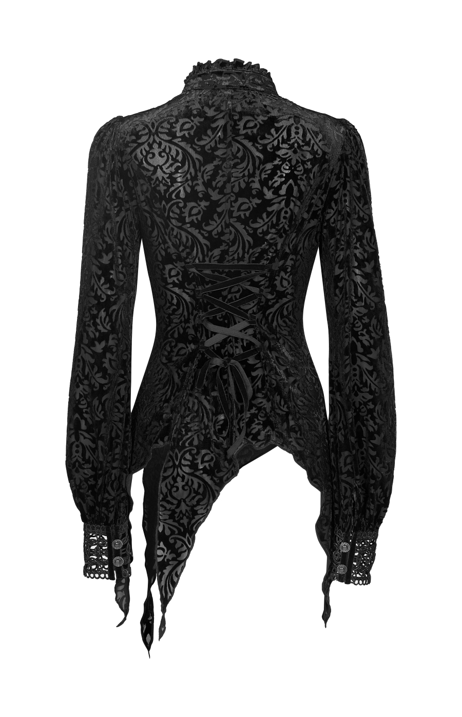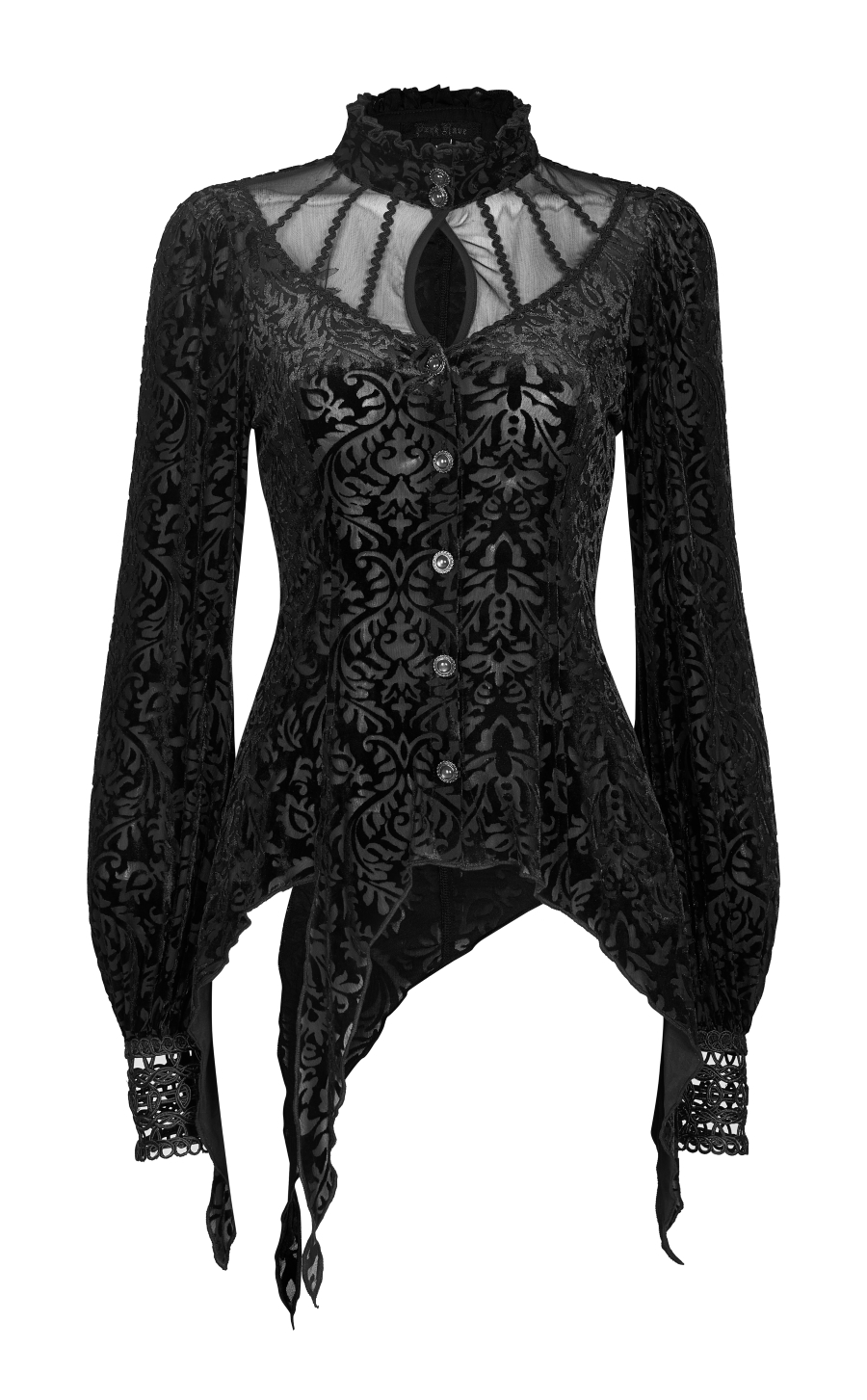 Ce chemisier signé Punk Rave est fabriqué dans un tissu léger légèrement transparent floqué de motifs baroques en velours (burnt flocking)