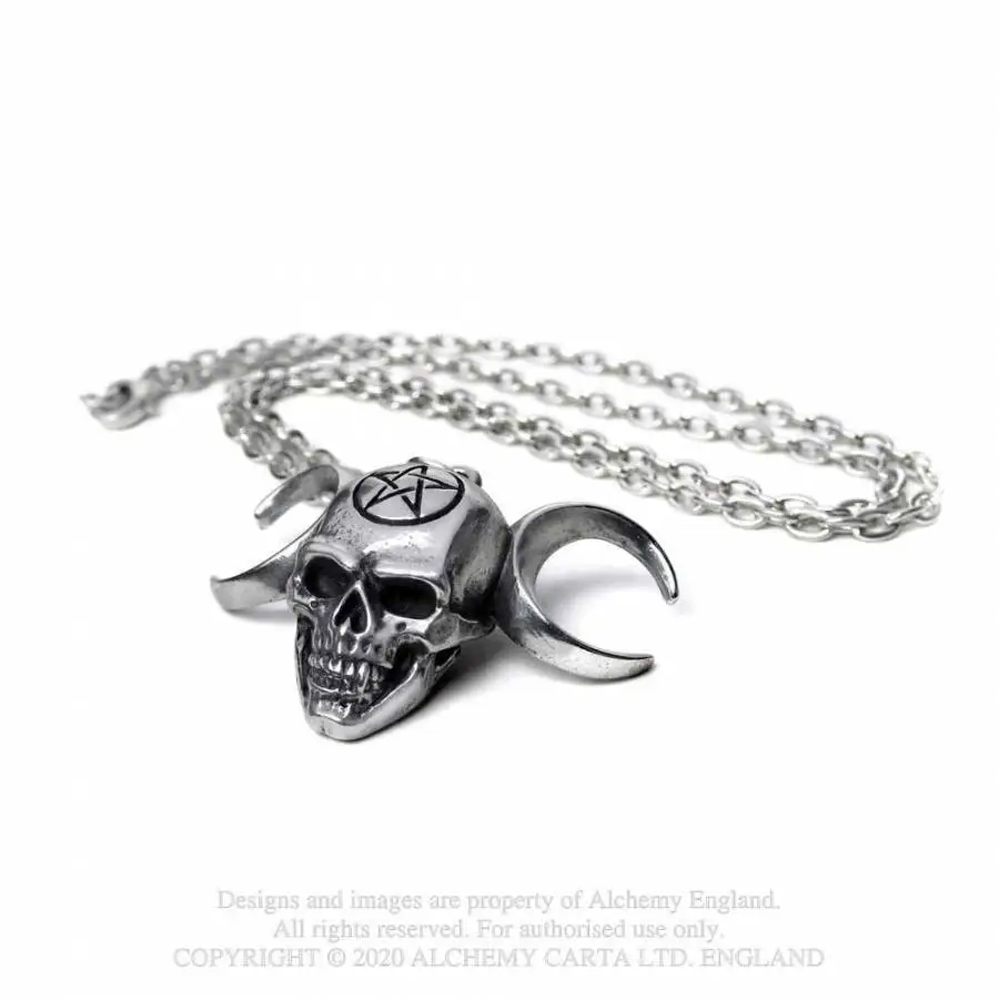 Un pendentif en étain Anglais de 43 mm de large représentant un crâne gravé d’un pentagramme avec un croissant de lune de chaque côté