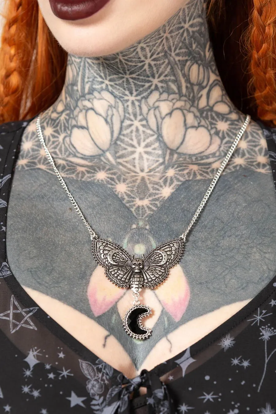 Composé d’un grand papillon à tete de mort avec un croissant de lune noire pendant