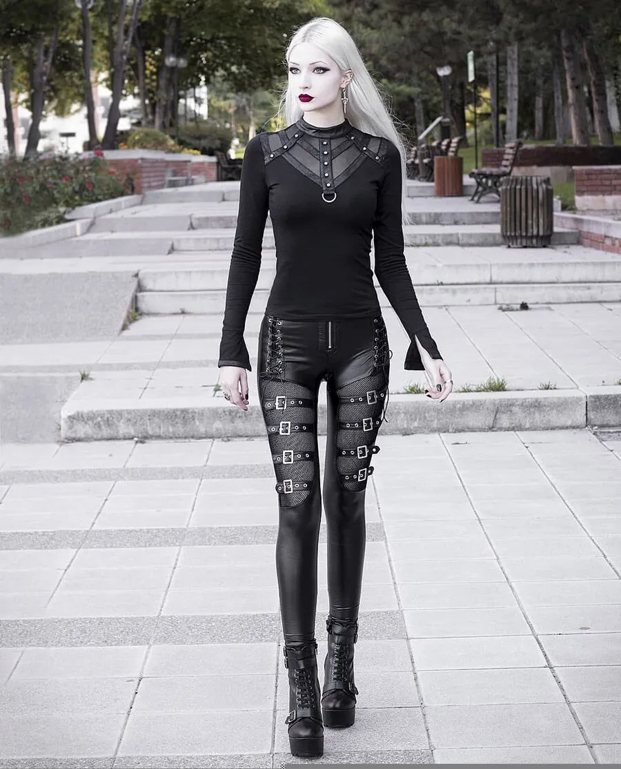 Pantalon goth de style visual kei en tissu look cuir noir très fin et souple