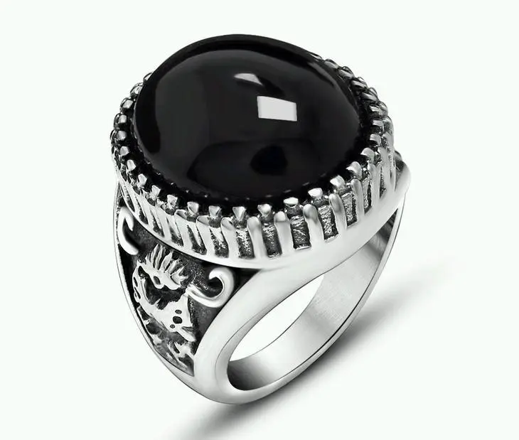 Superbe bague gothique en inox poli et finement ciselé décorée d’une pierre d’agate noire
