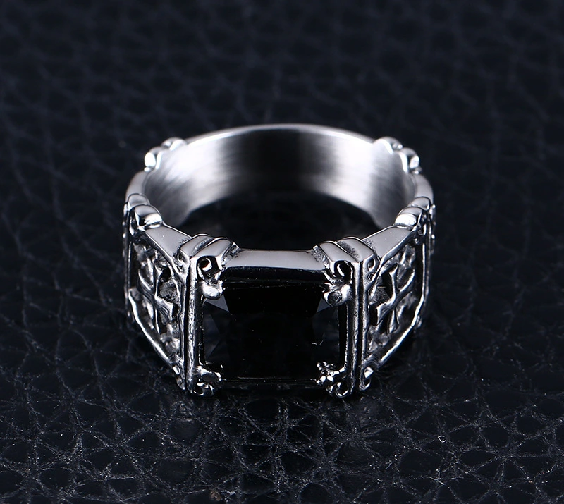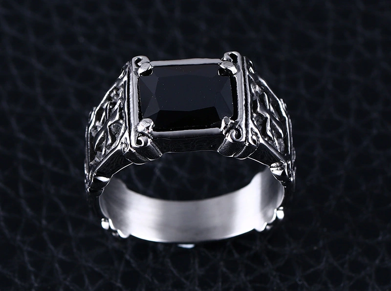 Petite bague fine en inox poli miroir décorée d’une pierre rectangulaire noire en zirconium, de petites croix gothiques viennent embellir les côtés