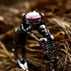 Bague gothique avec deux squelettes tenant une belle pierre rouge en zirconium