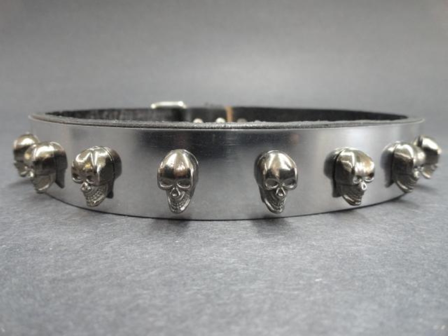 Collier gothique en cuir de type ras de cou avec une plaque de métal poli ornée de 15 gros skulls métalliques