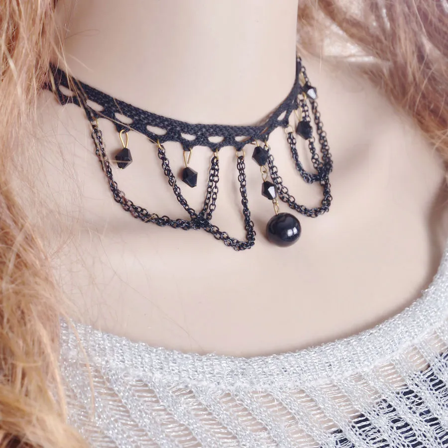 Très raffiné et élégant, ce collier en tissu broderie est agrémenté d’une perle noire synthétique