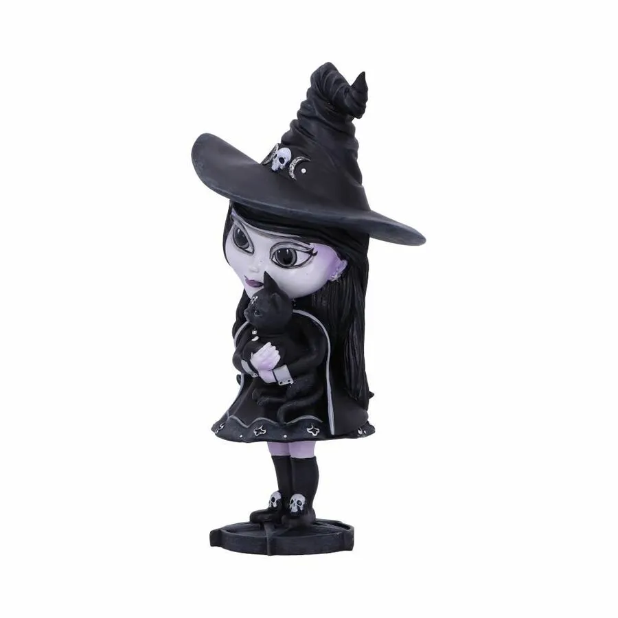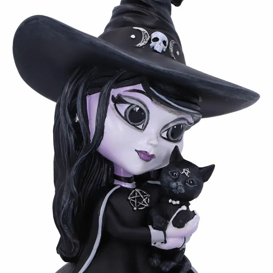 Fabriquée en polyrésine et peinte à la main pour assurer une finition magistrale, cette figurine Hexara se dresse avec son grand chapeau de sorcière et son petit chat noir dan sles bras