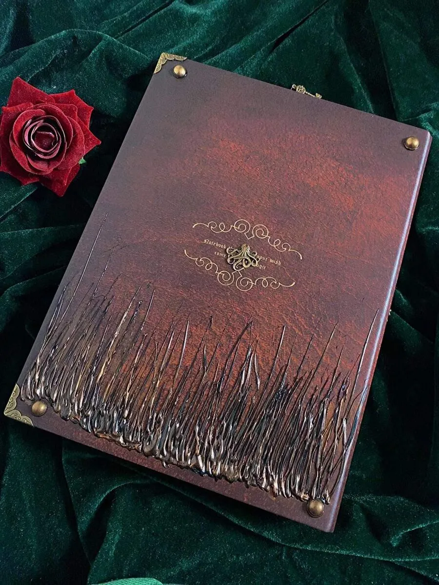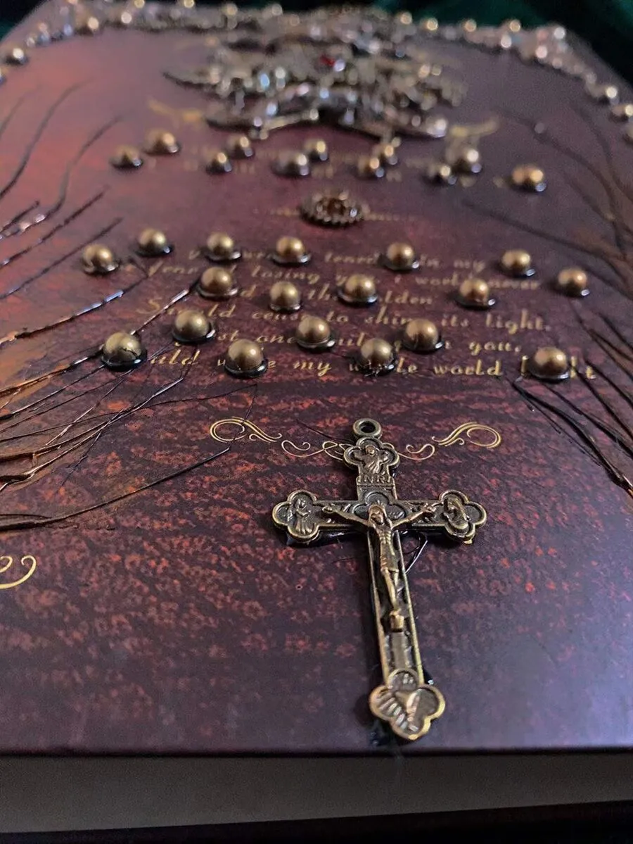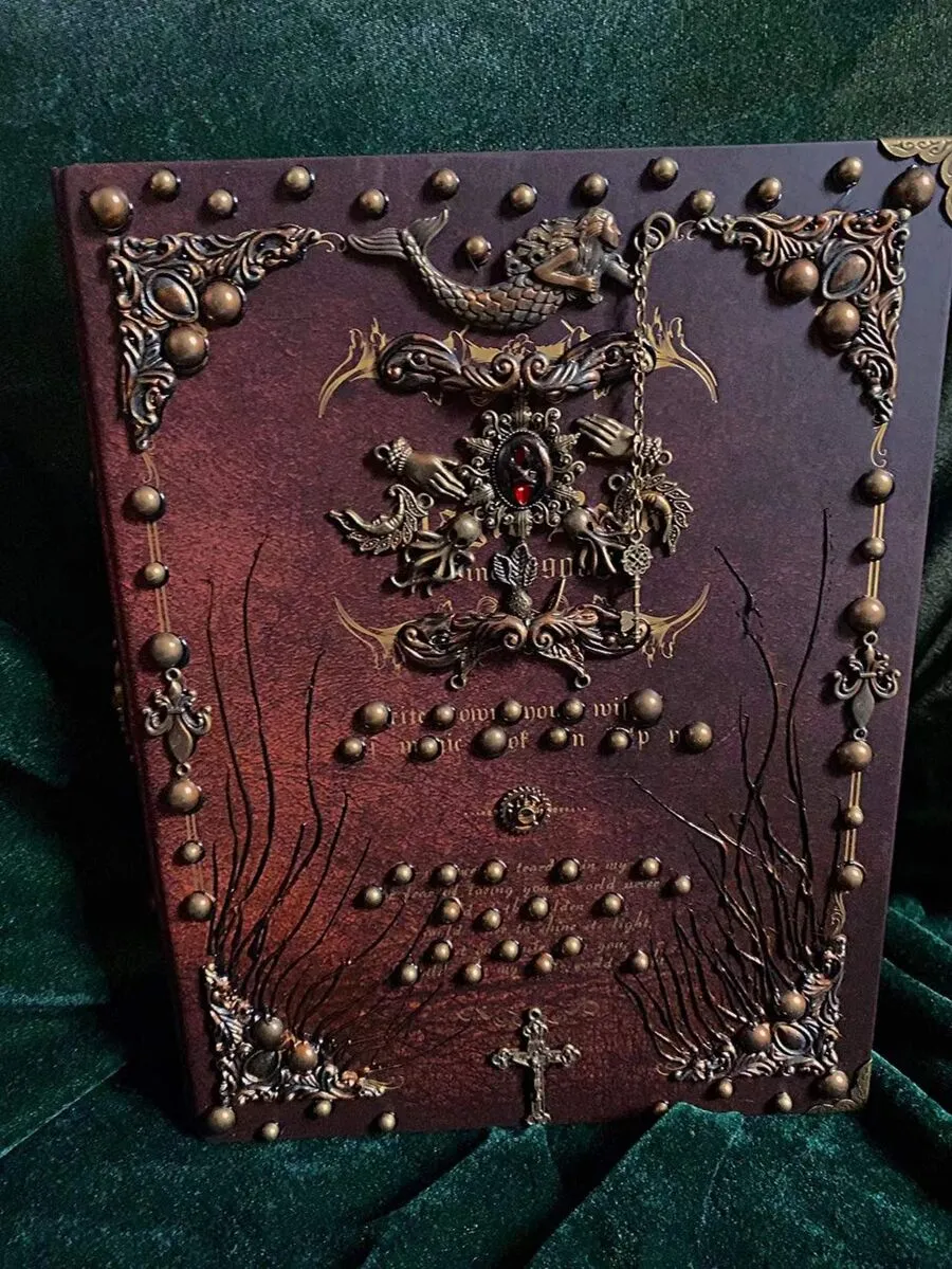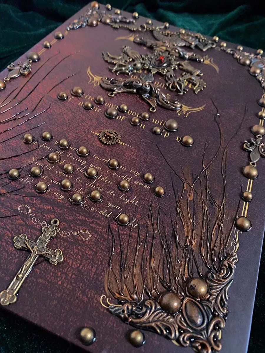 Couverture rigide bordeaux ornée de nombreuses pièces de cuivre