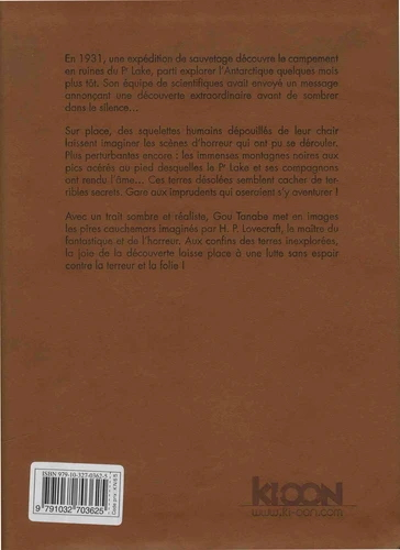 En 1931, une expédition de sauvetage découvre le campement en ruines du Pr Lake, parti explorer l’Antarctique quelques mois plus tôt. Son équipe de scientifiques avait envoyé un message annonçant une découverte extraordinaire avant de sombrer dans le silence… Sur place, des squelettes humains dépouillés de leur chair laissent imaginer les scènes d’horreur qui ont pu se dérouler. Plus perturbantes encore : les immenses montagnes noires aux pics acérés au pied desquelles le Pr Lake et ses compagnons ont rendu l’âme…