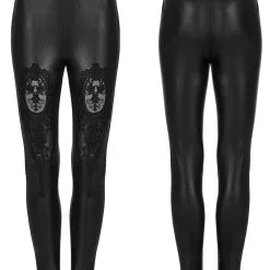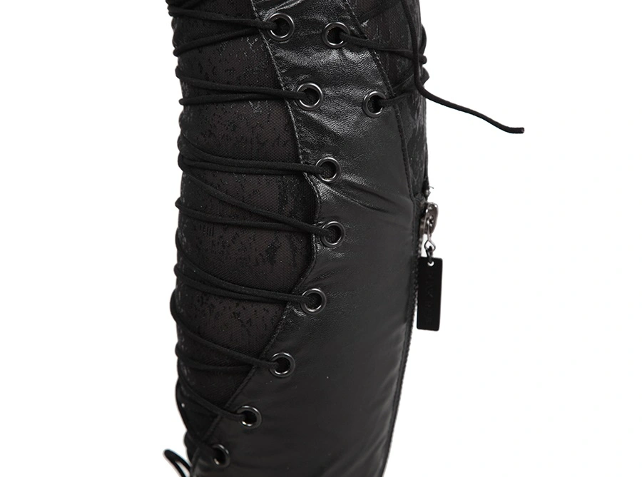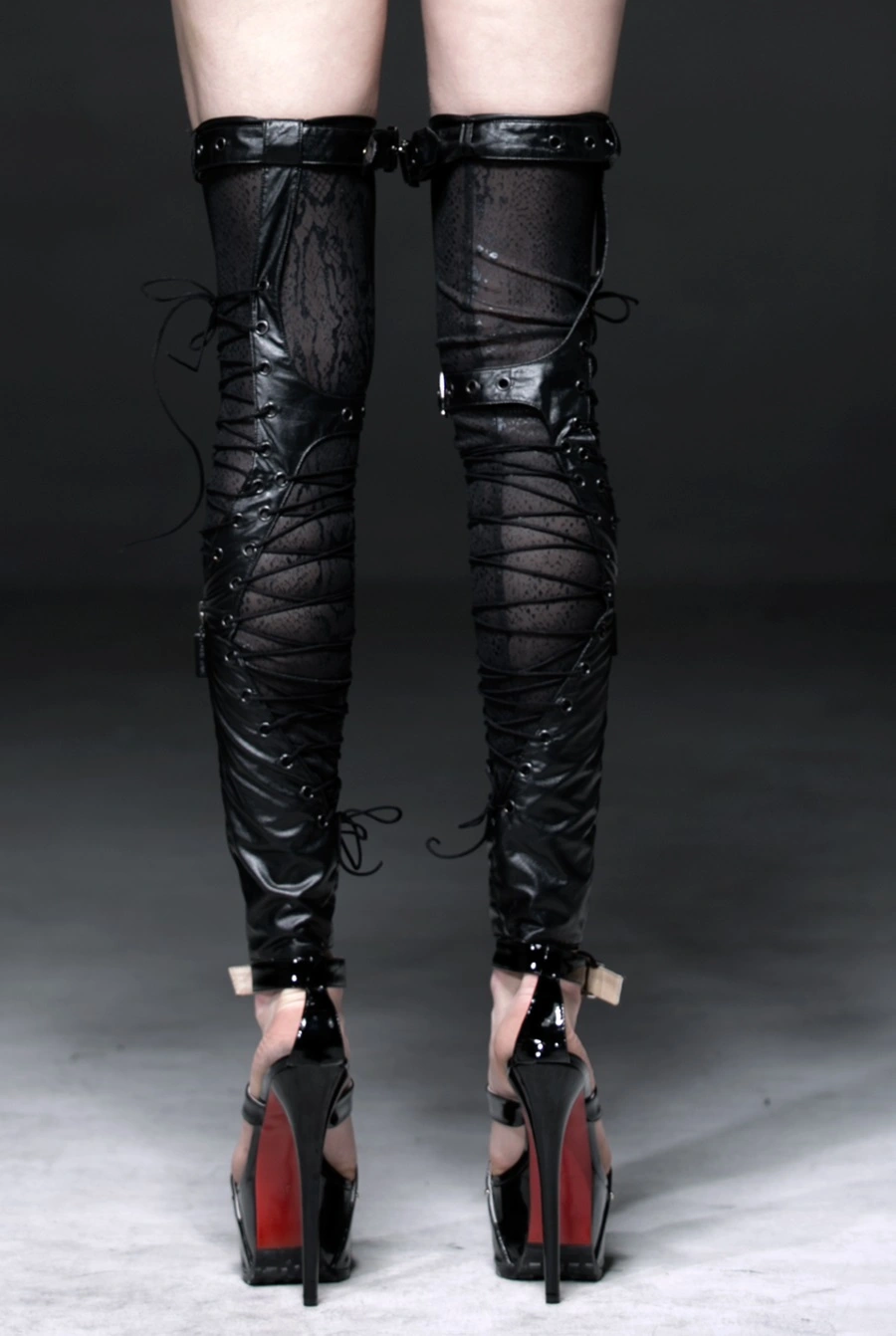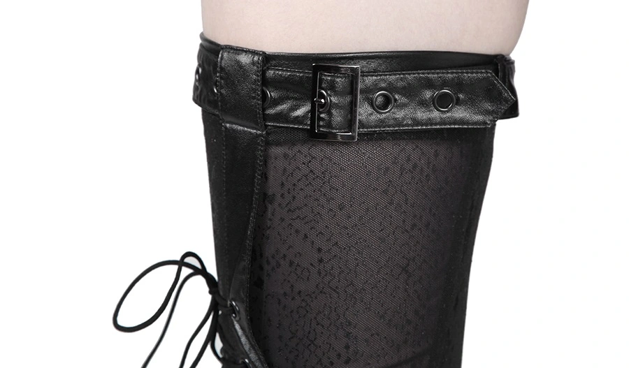 Paire de guêtres gothiques en tissu transparent et cuir noir ornée de grands laçages par cordon , 2 sangles de réglage, fermeture éclair de 23 cm sur le bas