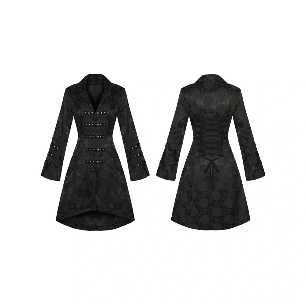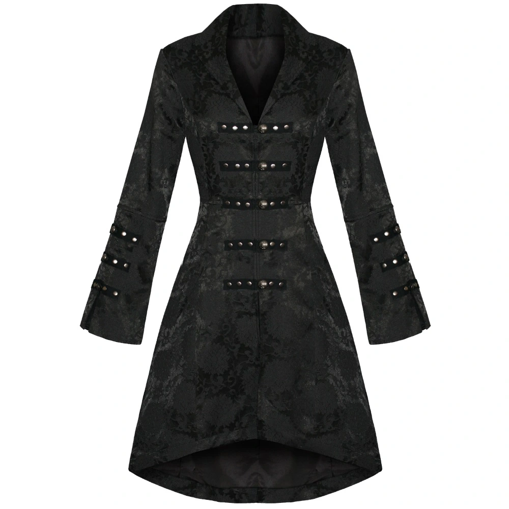 Très belle veste gothique style militaire en tissu brocarde floral, elle est décorée de pièces de tissu épais ornées de rivets métalliques, jolis boutons de fermeture spécifiques, manches légèrement évasées avec rappel de rivets