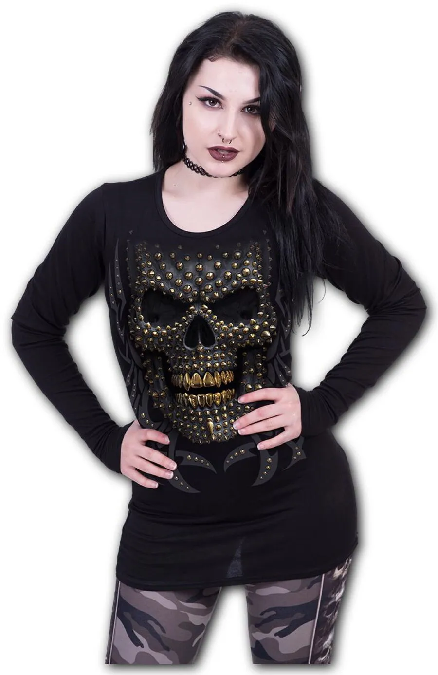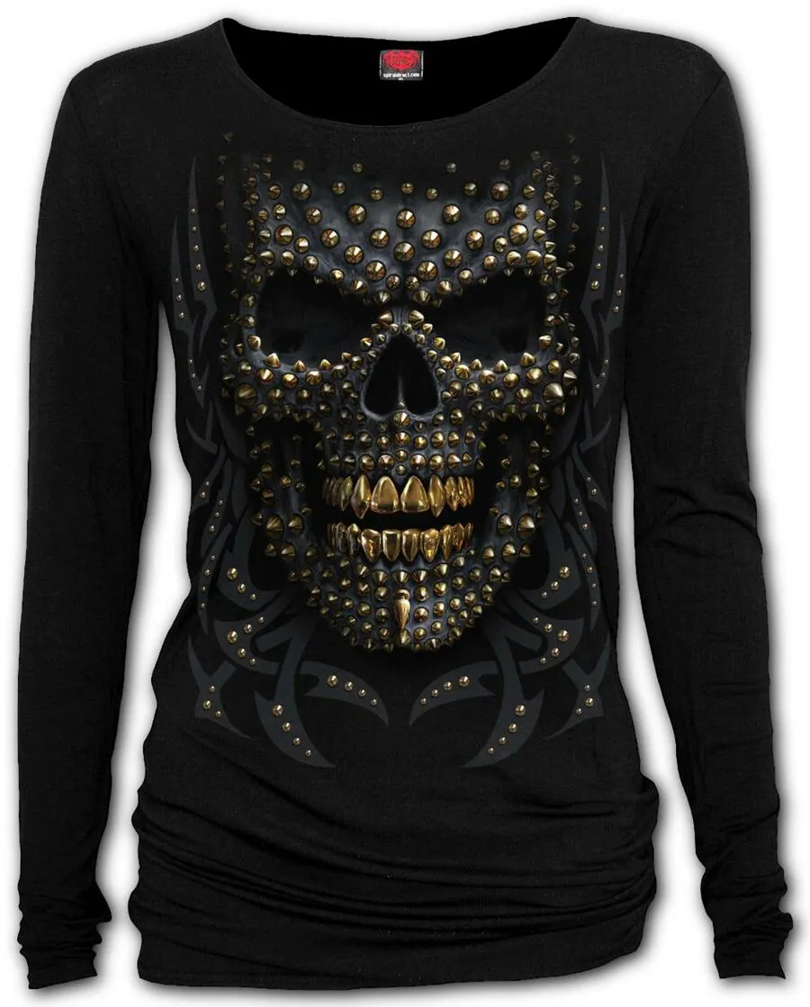 Une immense sérigraphie d’un skull décoré d’innombrables clous dorés, le résultat est époustouflant