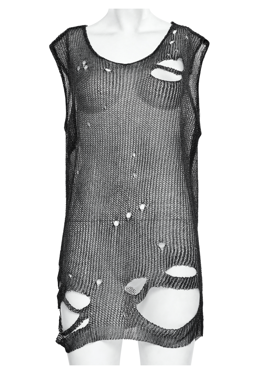 Tissu imitation métal ! En effet ce haut post-apocalypse noir Punk Rave est fabriqué dans un tissu très original imitation fil en métal, l’aspect est bluffant !