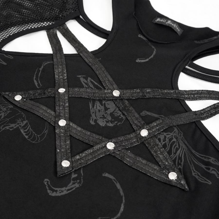 Il est agrémenté d’un grand pentagramme fait de bandes de simili cuir vieilli avec des rivets de décoration