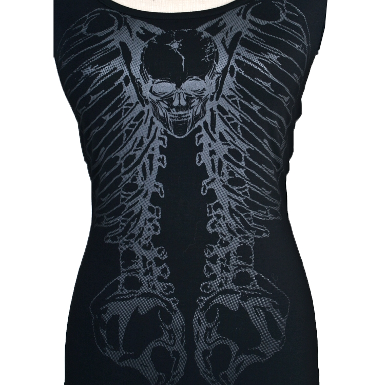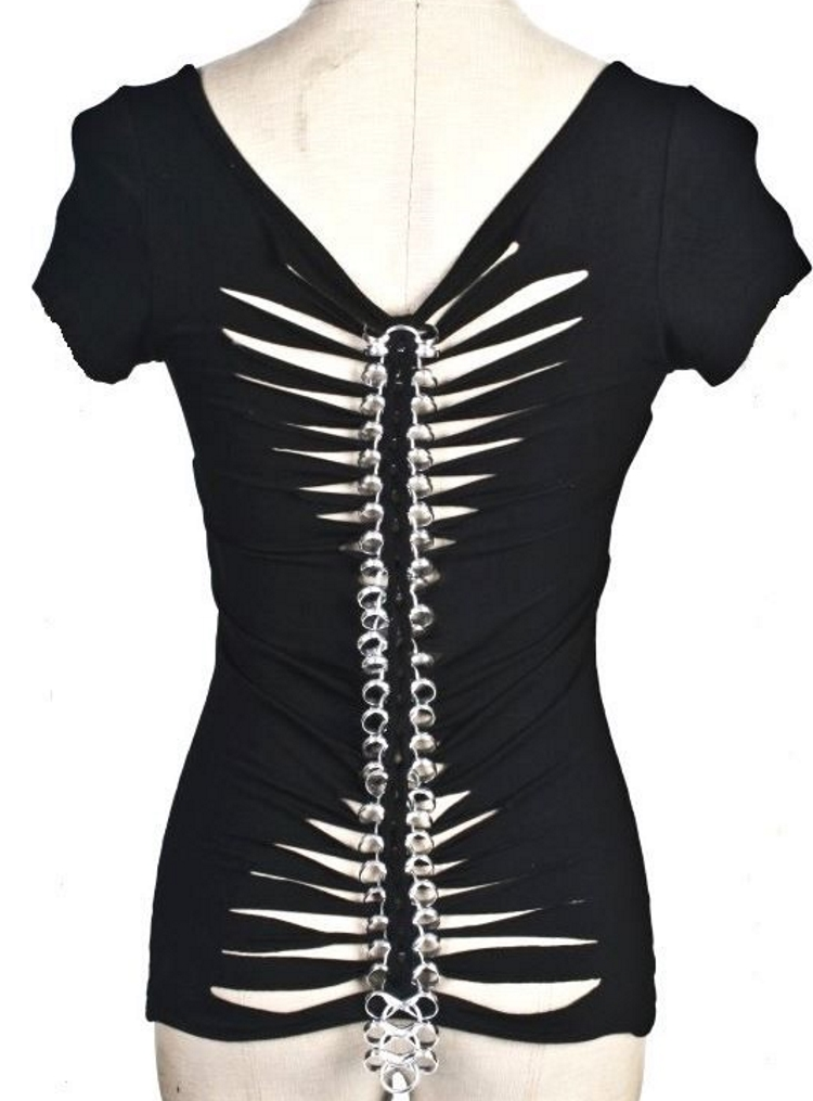 Haut de style gothique très original avec sa colonne vertébrale en métal ! En effet le dos est agrémenté d’anneaux métalliques formant un colonne vertébrale, effet saisissant ! Les effets déchirés accentuent encore un peu plus le style hors du commun de ce modèle
