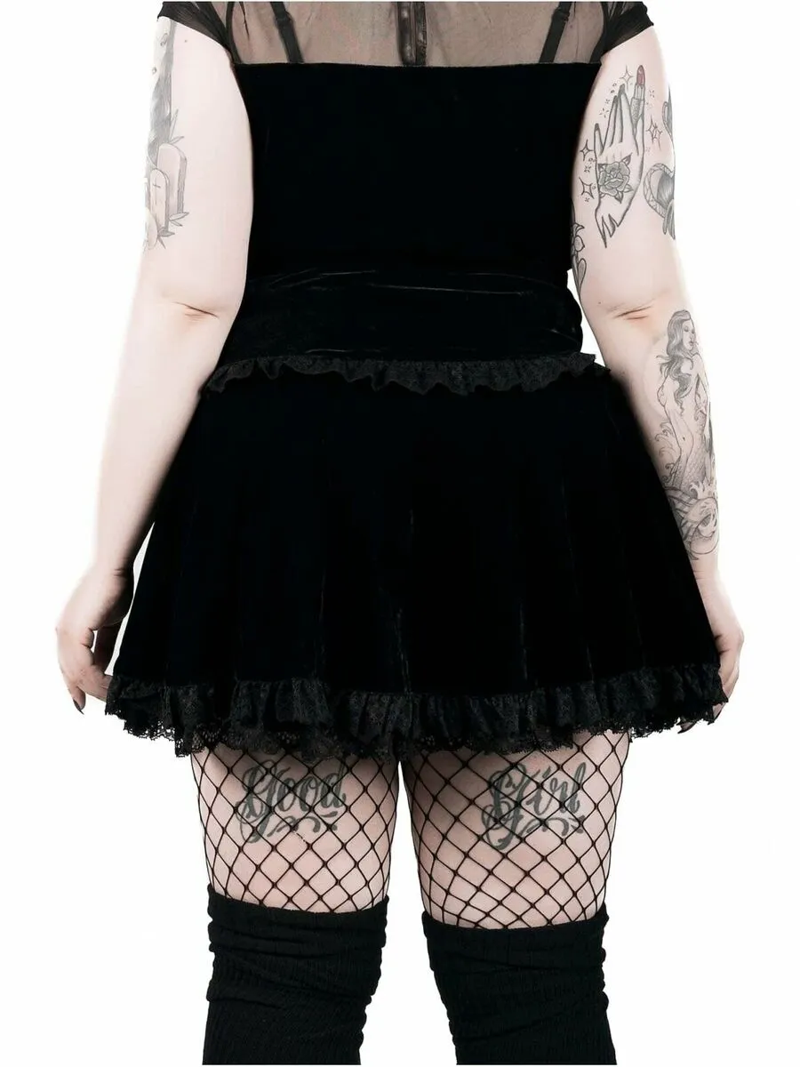 Cette jupe est composée d’un premier jupon de satin noir recouvert par un jupon de tulle bordé de dentelle, lme tout recouvert par un velours de grande qualité