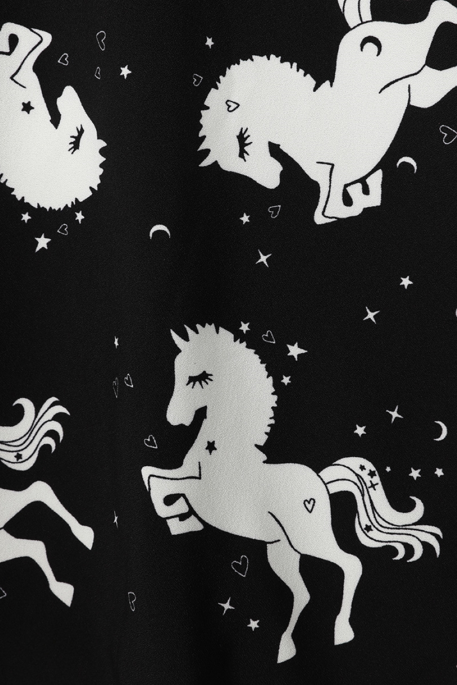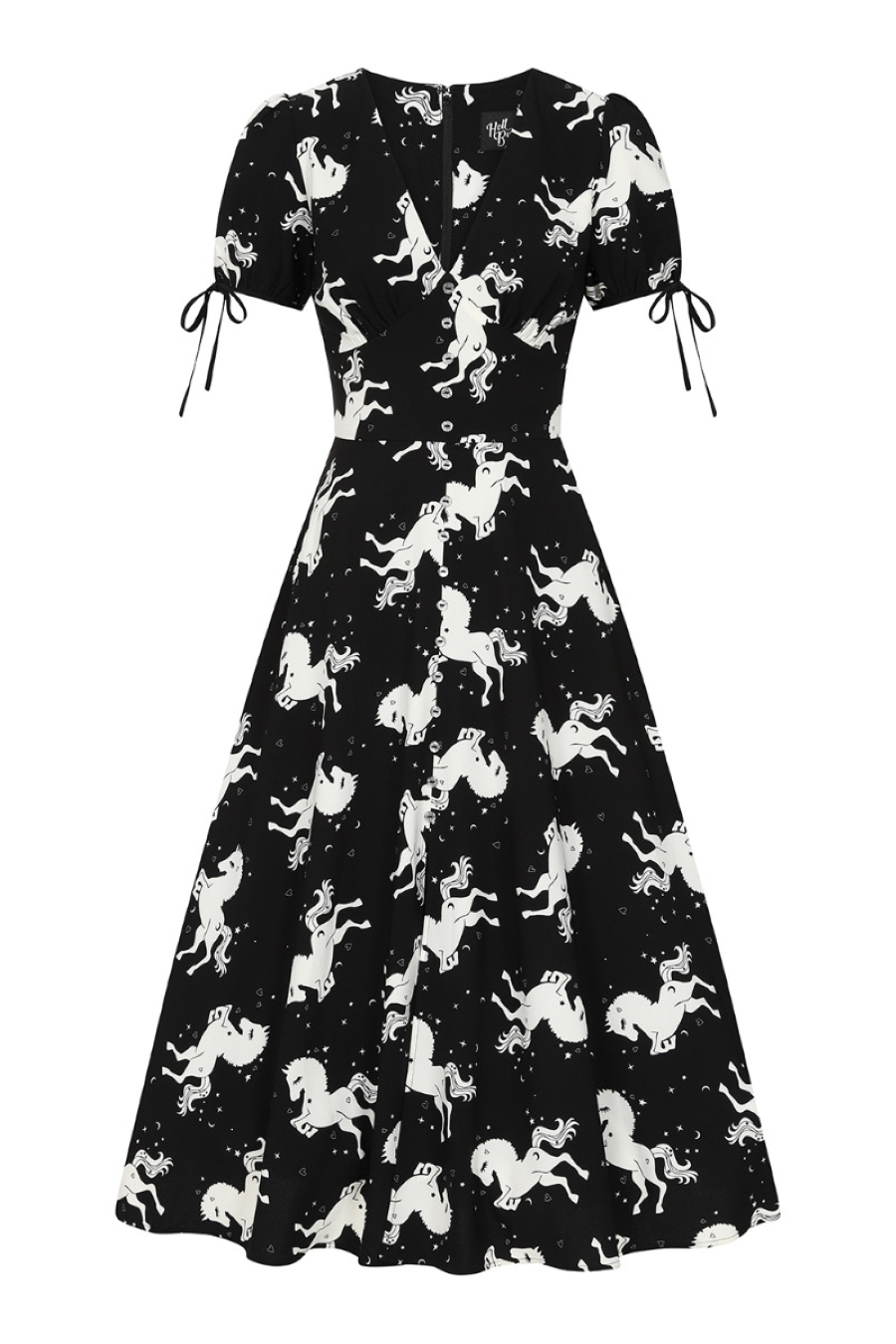 Cette belle robe noire signée Hell Bunny possède un imprimé de licornes dans un pur esprit Fantasy