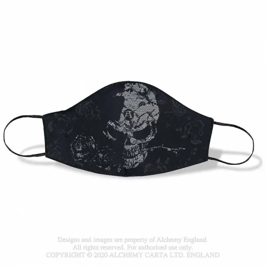 Masque de visage en tissu imprimé du fameux skull Alchemy Gothic avec une rose dans la bouche