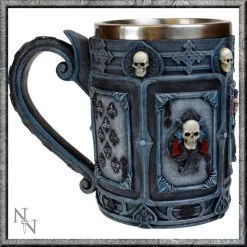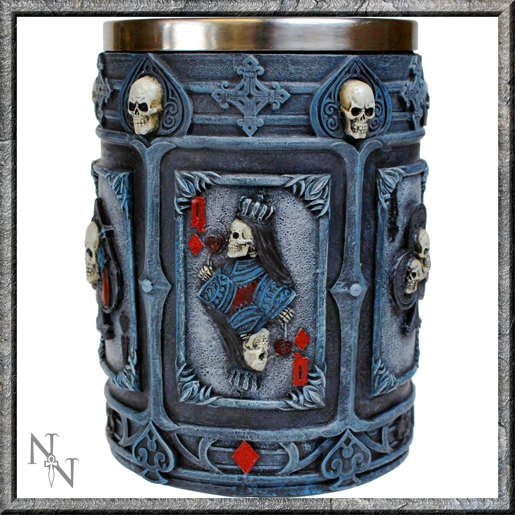 Belle chope gothique en résine effet vieilli décorée de cartes à jouer et de têtes de mort, l’intérieur est en inox pour un lavage facile
