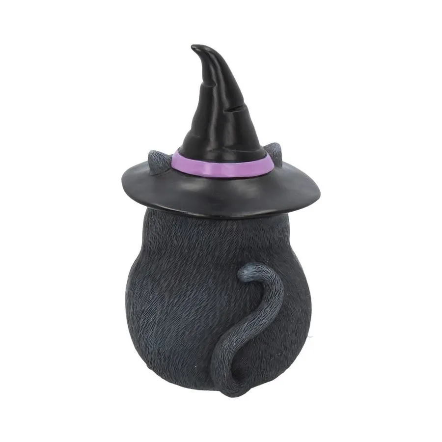 Sur sa tête, ses oreilles traversent le bord d’un grand chapeau de sorcière noir