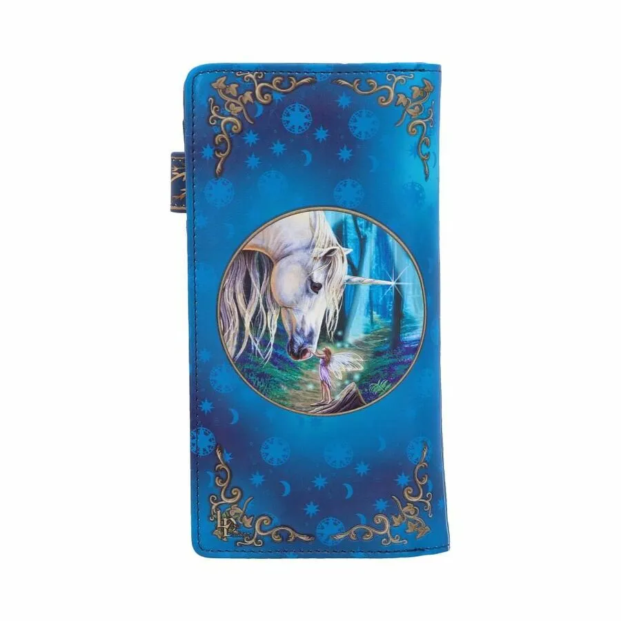 Lorsque la licorne se penche vers le bas, sa longue crinière indomptée suit. Derrière les créatures mystiques se trouve un bois luxuriant de jacinthes des bois au crépuscule, complétant la scène magique